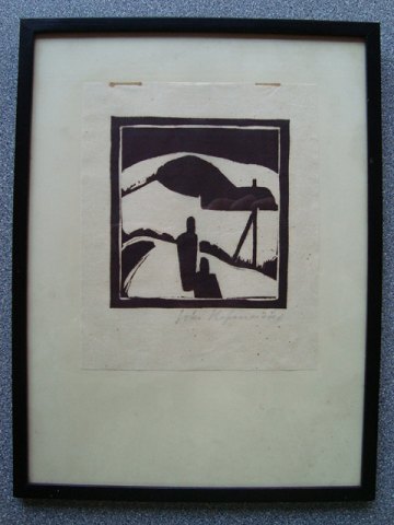 Text available in Danish: Linoleumssnit af Johannes Hofmeister - Personer i landskab.