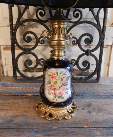 Smuk bordlampe med håndmalede blomster motiver monteret på lue forgyldt bronzefod.