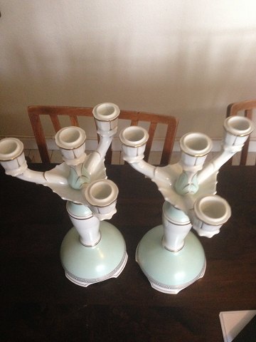 Bing og Grøndahl par 4-armet Candelabra i mintgrøn og med guld. Måler 38,5cm høje og er i perfekt stand.