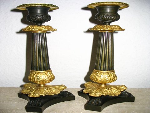 Par franske empire stager i bronze, o. 1820, tresidet fodstykke med base i form af løvefødder og akantusblade, kannelleret mellemstykke og tylle med dekoration. H.: 31 cm. Sublim stand!