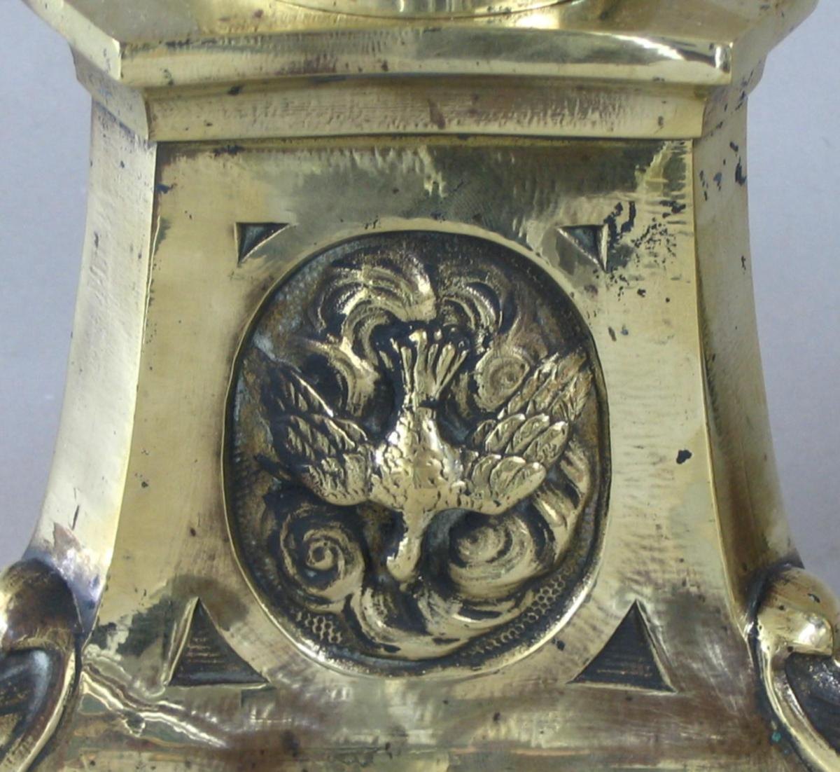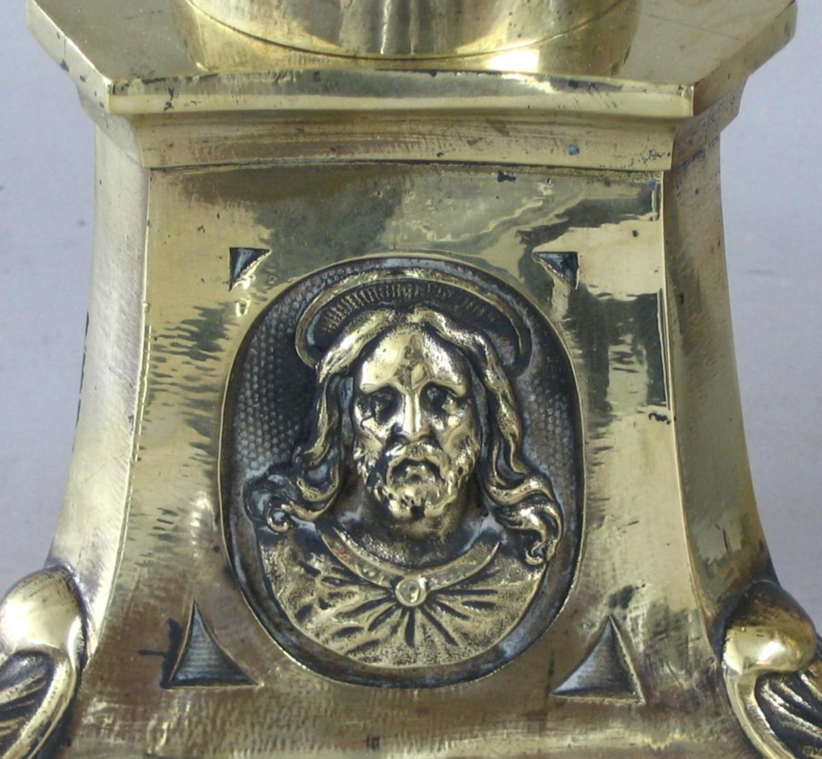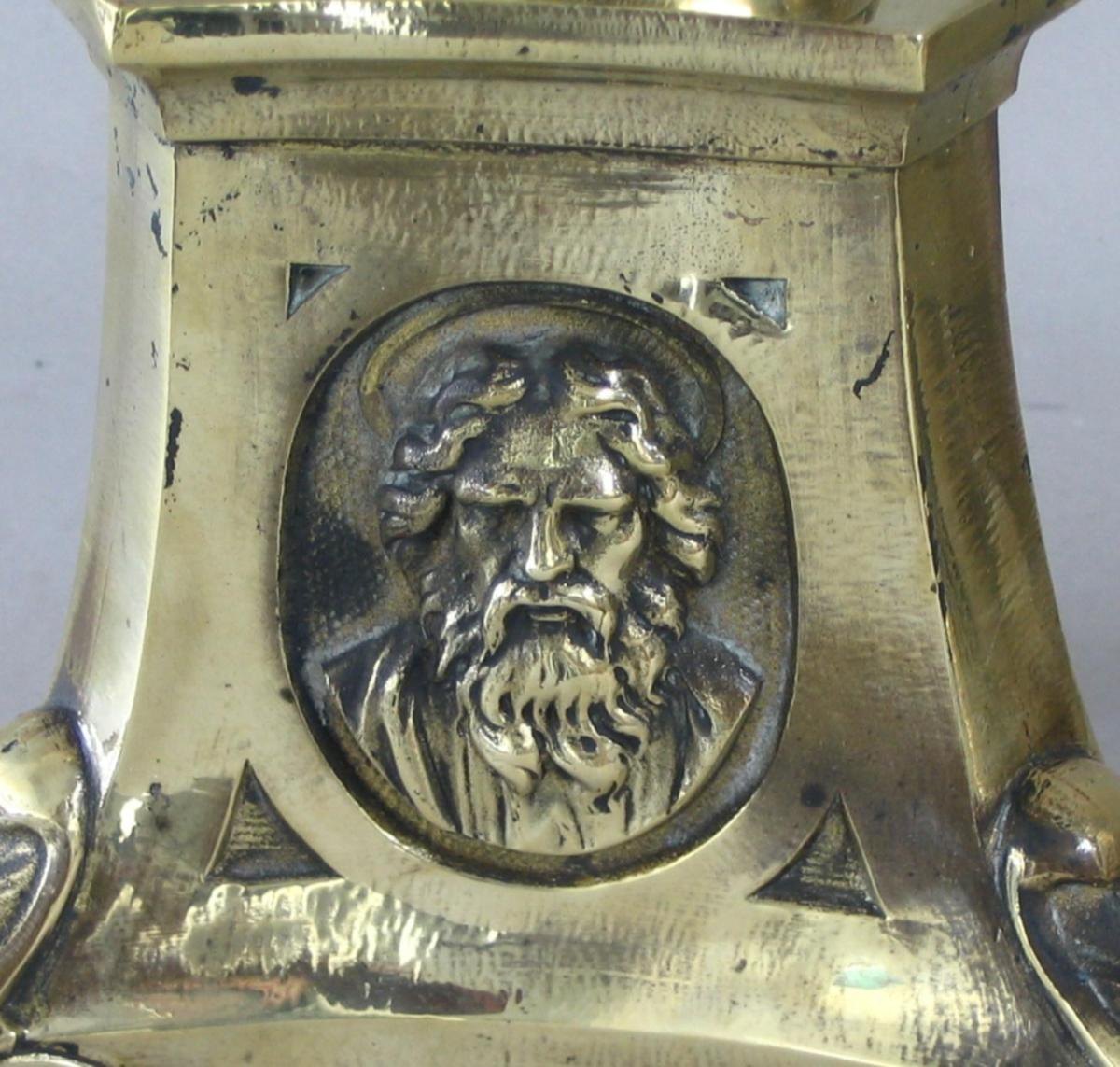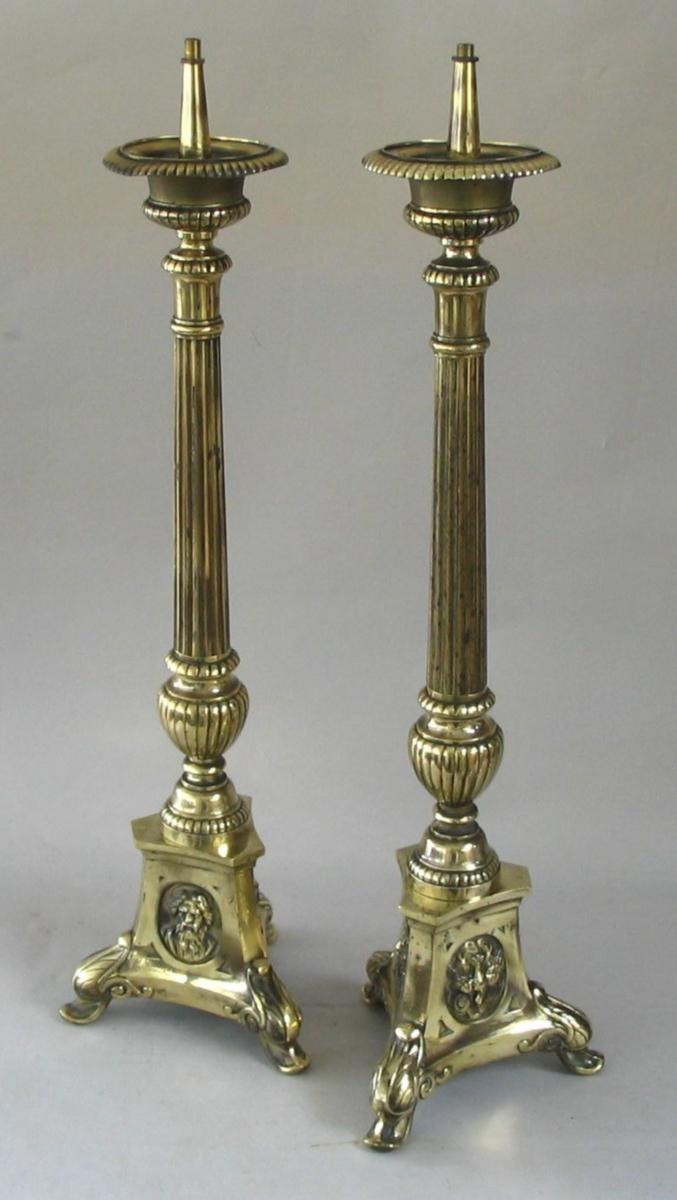 Par alterstager i messing, 19. årh. , base med tre fødder med akantus ornamentik, base med religiøse motiver, bl.a. Kristus, Hellig ånds duen m.v. kannelleret stamme og drypskål. H.: 70 cm. Spids til lys monteret til el.