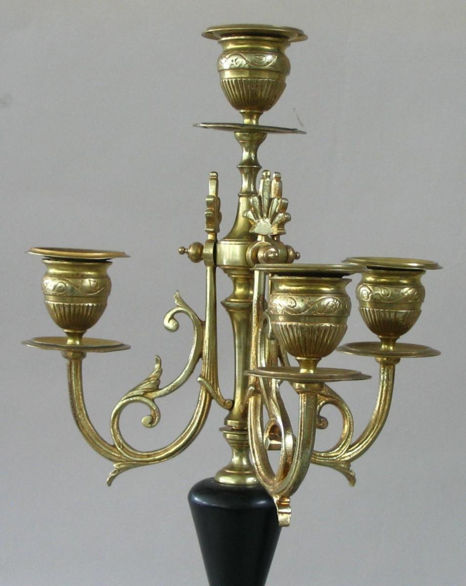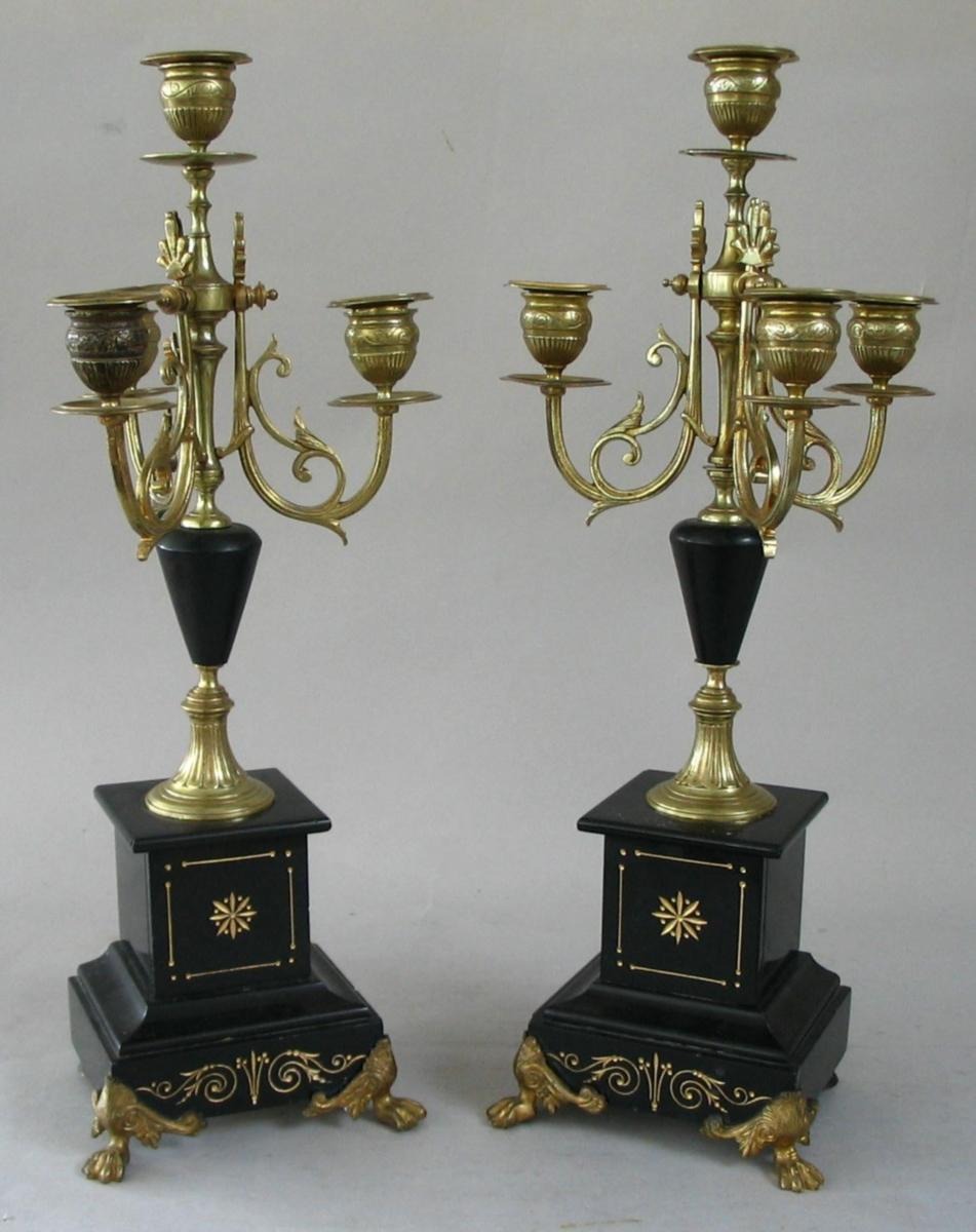 Par franske kandelabre med fire lysarme, messing og sort marmor; ben i bronze i form af løvefødder, base i sort marmor med dekorationer, base på stage i messing med dekoration og mellemstykke i sort marmor. o. 1880. 47 cm. Flot stand!