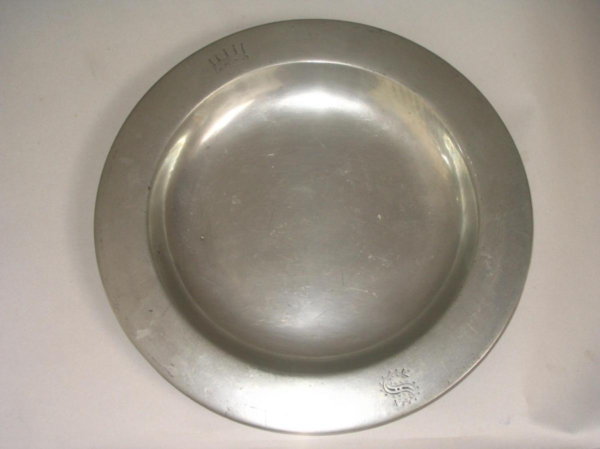 Engelsk tintallerken, 19. årh. Stemplet.: W. Scott, og tidsel. Fane med stort indgraveret.: S og grevekrone. Dia.: 24,5 cm. Fantastisk flot stand!