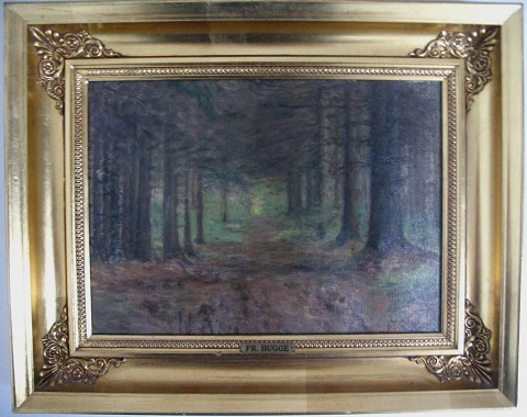 Bugge, Frida (1874-1964) Danmark: En granskov - sommer - Hellebæk. Olie på lærred. Sign.: F. Bugge. 22 x 30 cm.