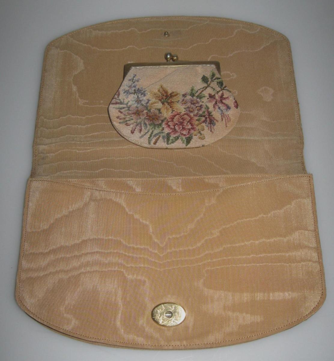 Dametaske i petit point med rococo mønster med personer på en bred med træer og får. Lysebrunt silke. 1933. Østrig. Indvendig med label.: Gobelins & Kunstgewerbe. O. Kessler & Co. Wien. Kartnerstrasse 37. Indvendig med pung og minikalender. L.: 19 cm.