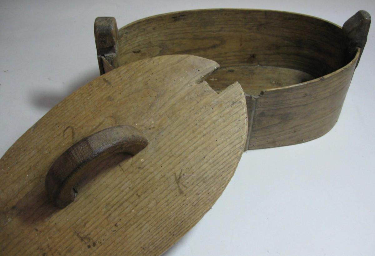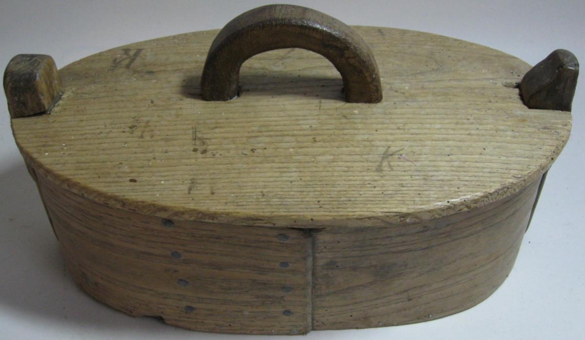 Antik madtejne, Danmark, 19. årh. I vokset bøgetræ, spån. Med bund i fyr. Håndtag i mørkere eg. H.: 22 cm. L.: 39 cm. På låg monogram med K.