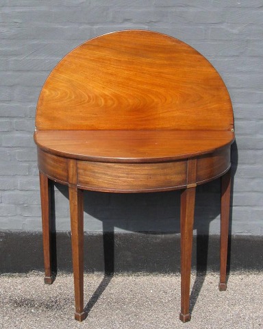 Demi lune spillebord i mahogni, Danmark, o. 1800, med tilspidsede ben. H.: 75 cm. Dia. plade: 90 cm.