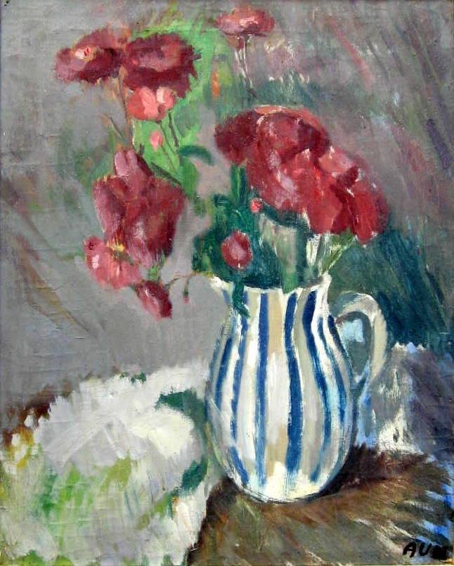 Ulmer, Axel Johannes (1884-) Danmark: Opstilling med blomster i en stribet kande på et bord. Olie på lærred. Signeret: Monogram 31. 58 x 45 cm. Med gråmalet samtidig ramme.
