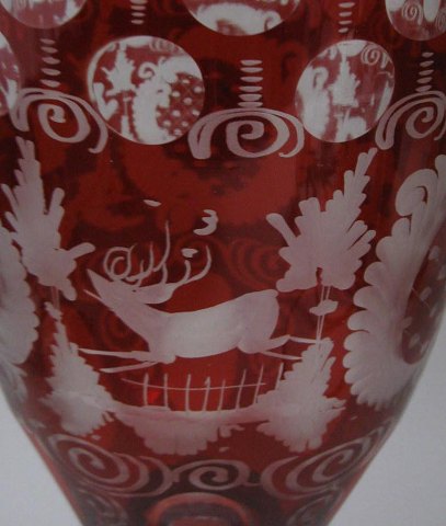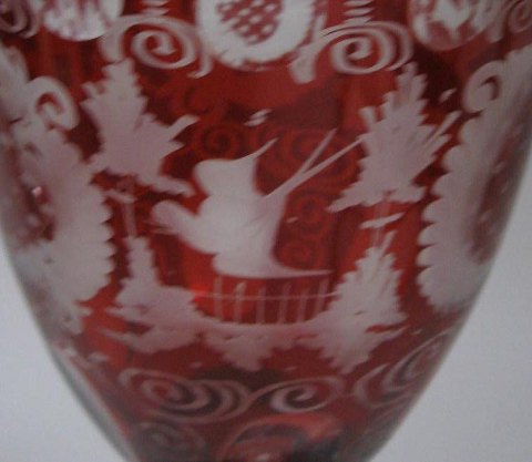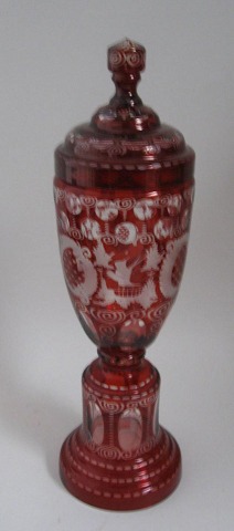 Stor Böhmisk lågpokal, 20. årh. i klart krystal glas med rødt gennemslebet overfang. Dekoration i form af rococo mønstre, borge og fugle. Faconslibninger på hele korpus og låg. H.: 41 cm.
