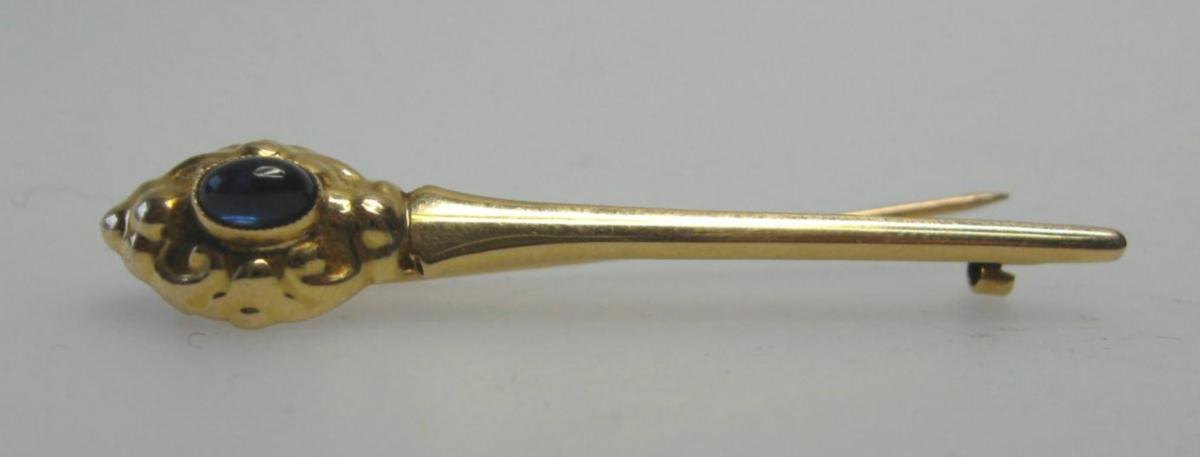 Gold Brooch in 14 carat with sapphire. Stamped .: BB, 585. L .: 5 cm. Wt .: 2.0 grams.