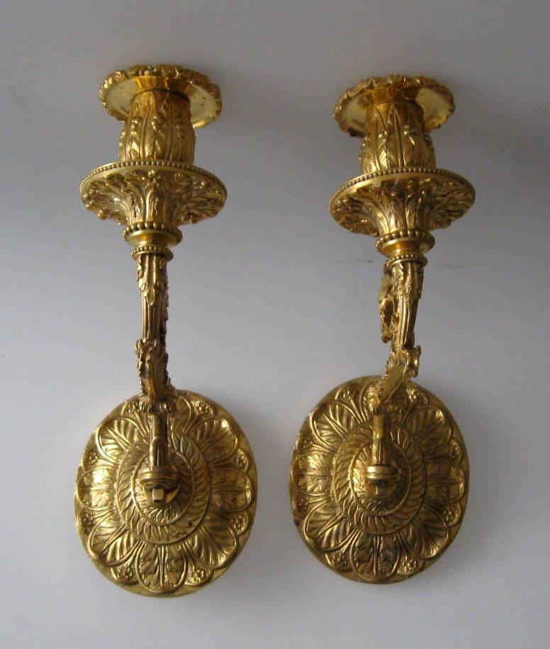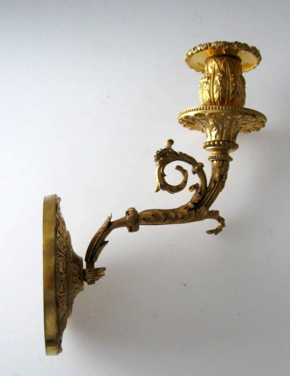 Par lueforgyldte franske bronze vægstager, 19. årh. Dekoreret med akantusblade. Ovale vægplader. L.: 10,5 cm. Armlængde.: 14 cm.