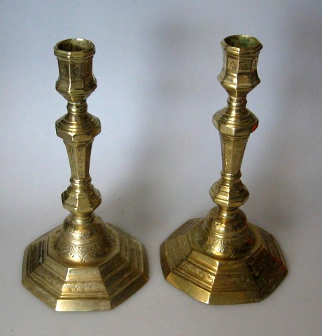 Par franske barokke stager, 18. årh. Octagon formet fod stamme og tylle. Med talrige dekorationer i bladmønster. H.: 23 cm.