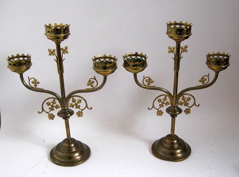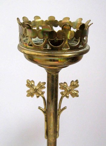 Par franske lueforgyldte kirkestager, 19. årh. Trearmede. På rund fod med bladdekorationer. H.: 44,5 cm.