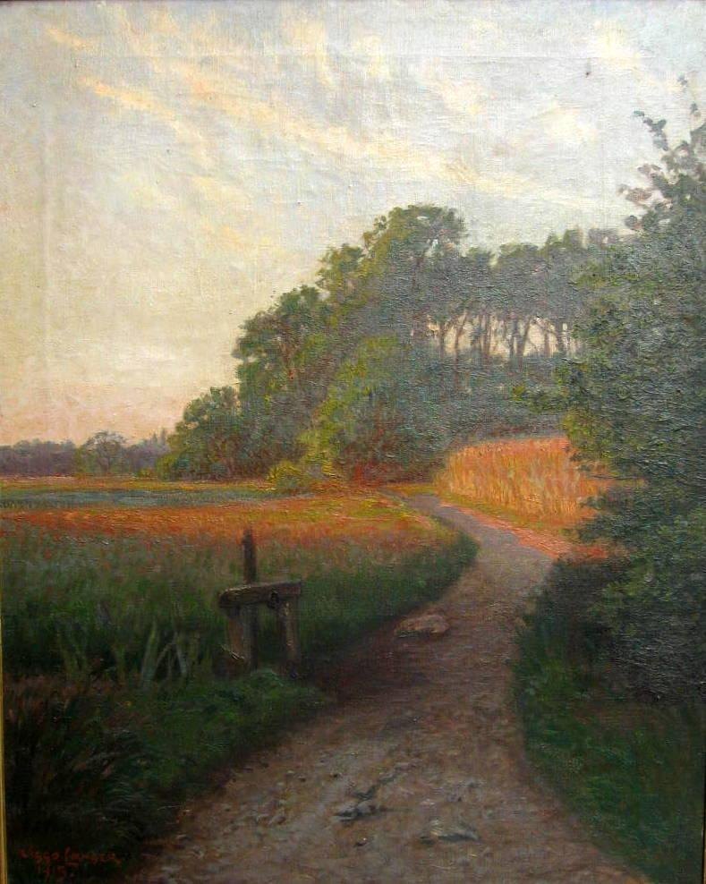 Langer, Viggo (1860 - 1942) Danmark: Solnedgang ved et skovbryn. Ved Skaaningdam, Hellebæk. Olie på lærred. Signeret.: Viggo Langer 1915. 58 x 47 cm. I samtidig forgyldt ramme.
