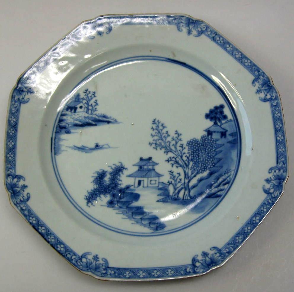 Octagon formet tallerken, Kina, o. 1800. Octagon formet fane. Spejl med dekoration i form af landskab og hav med båd. Med blå underglasur. Dia.: 21,5 cm. Ustemplet. Proveniens.: Litograf J. Chr. Sørensen.
