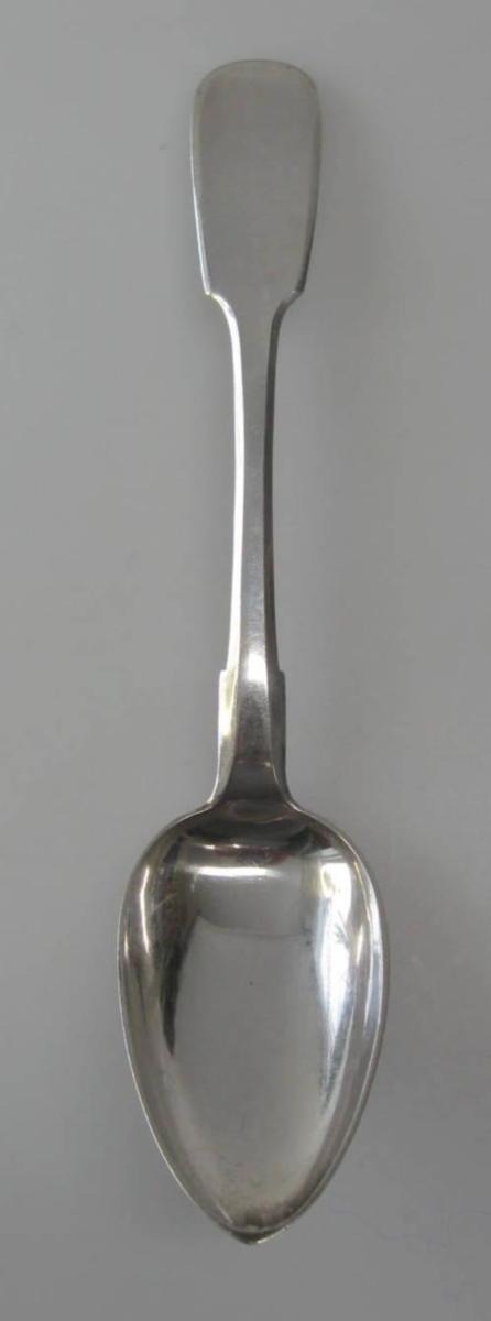 Russisk spiseske i sølv, 1881. Stemplet. L.: 22 cm. Vægt.: 65 gram. Med inskription.: F. G d. 13 Sept 1881.