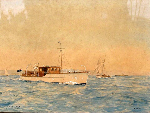 Tufnell, Eric Erskine Campell (1888 - 1979) England: Skibsportræt af M.Y. Lilida. Motorbåd. Akvarel, hævet med pastel. Signeret. 27 x 35 cm. I en hvid ramme.
