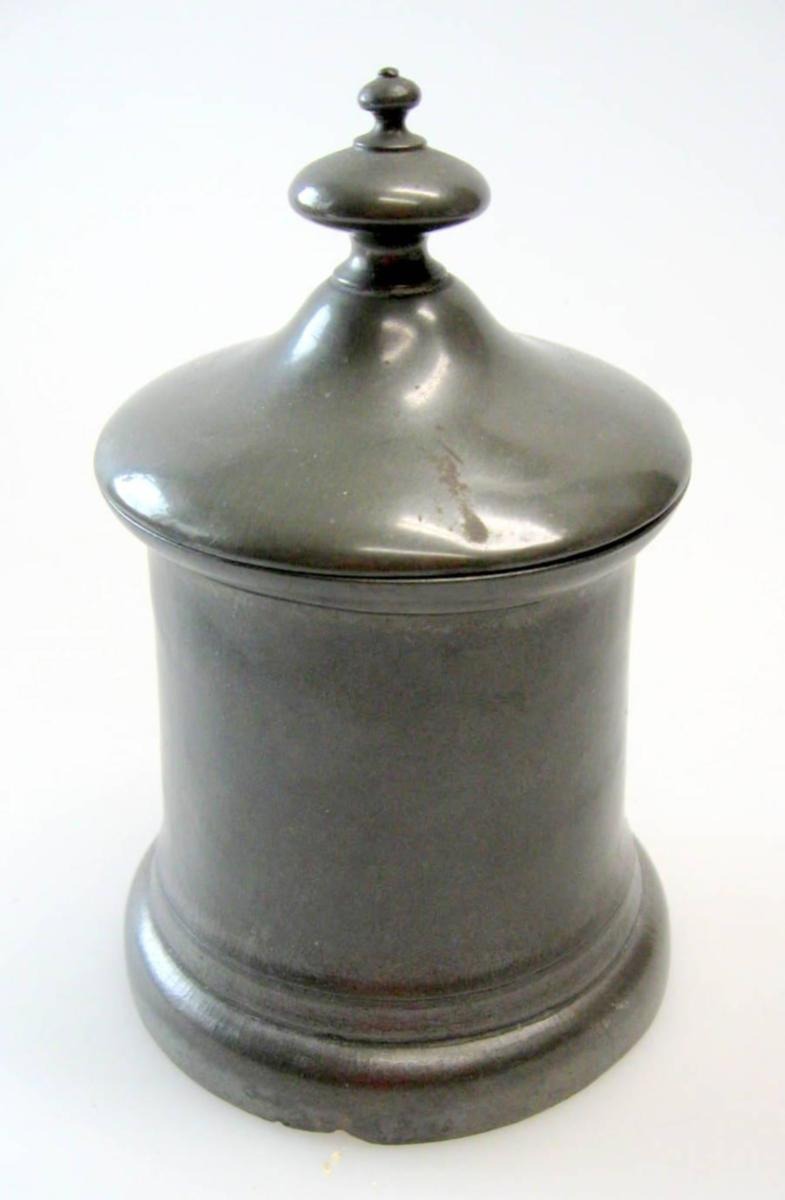 Tobaks krukke, 19. årh. i tin. Danmark. H.: 14 cm. Ingen synlige stempler.