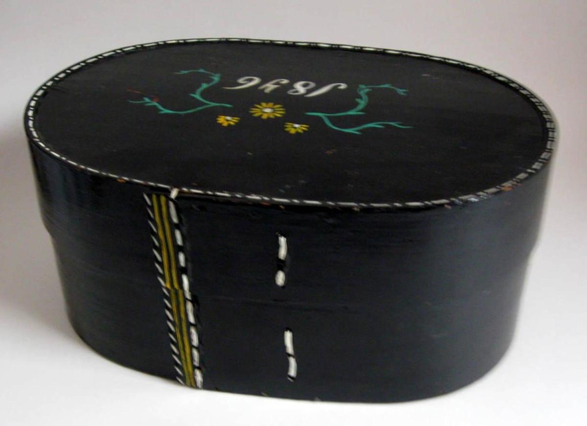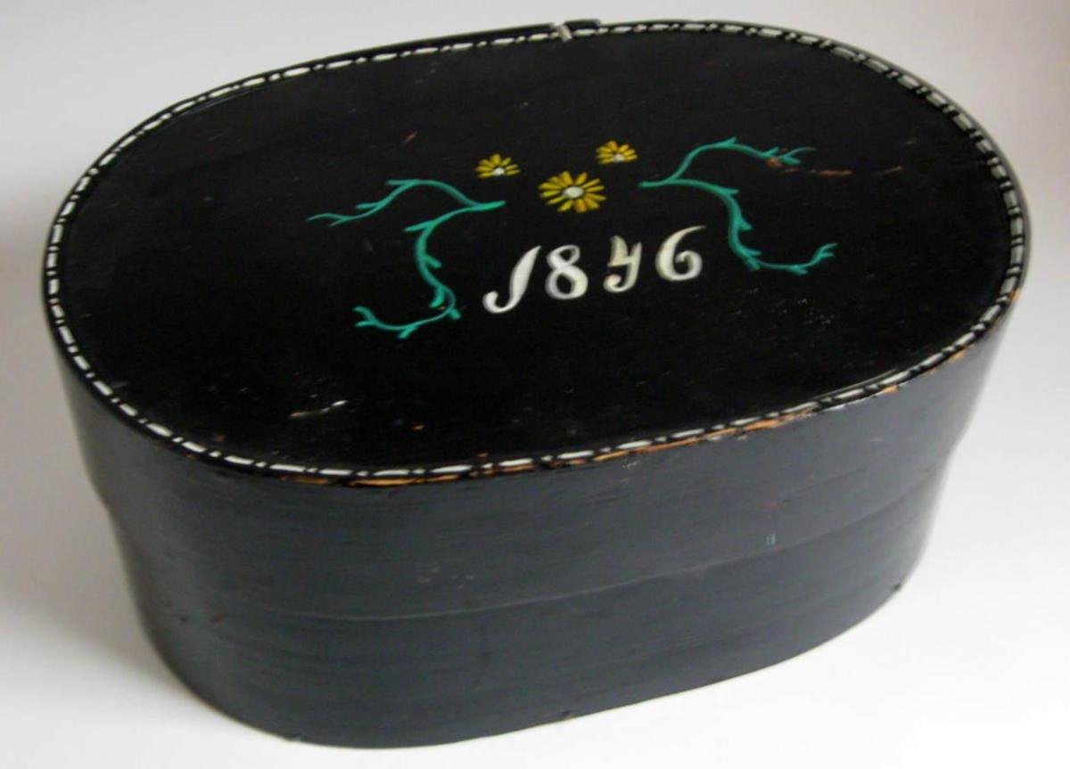 Paryk æske i bemalet spån, 1846. Danmark. Oval. Med nyere op malinger med årstallet: 1846. H.: 21 cm. L.: 46 cm. Bunden med signatur: F. W. Flot stand!