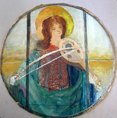 Tysk kunstner (20. årh.) Religiøs scene med spillende helgen. Gouache på pap. Dia.: 23 cm. Usigneret. I rund samtidig ramme. Antagelig udkast til vindue i kirke.