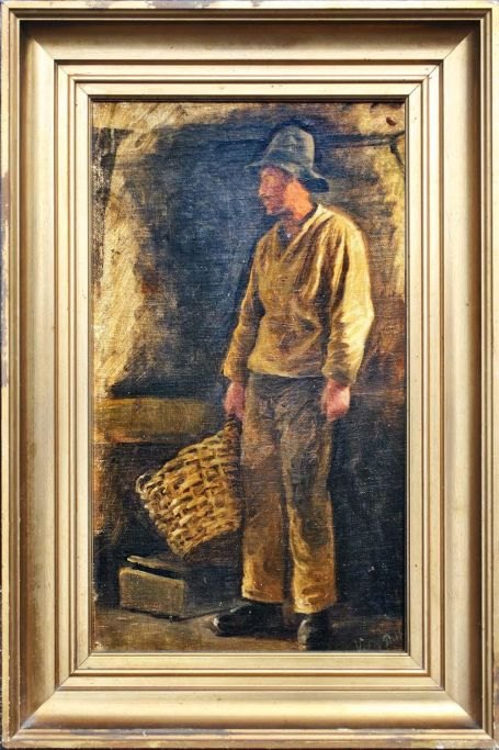 Pacht, Vilhelm (1843 - 1912) Danmark: Interiør med fisker. Olie på lærred/træ. Signeret.: Vilh. Pacht. 42 x 24 cm.