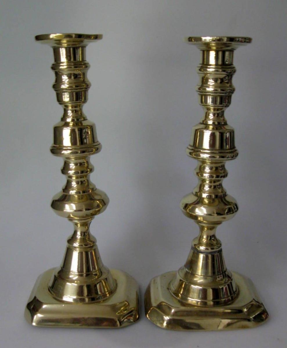 Par engelske Victorianske stager, o. 1880. Messing med afhvalvet rektangulær fod. Profileret stamme. H.: 23 cm.