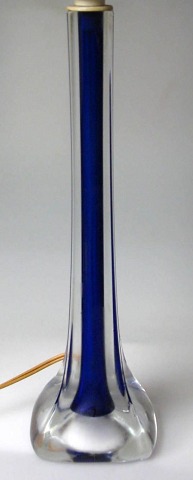 Flygfors bordlampe i glas, Sverige, 1960/70' erne, coboltblå glasmasse med klar overfang. Oprindelig udformet som lampe. H.: 35 cm. (til lampedelen). Signeret: Flygfors. Antagelig designet af: Paul Kedelv.