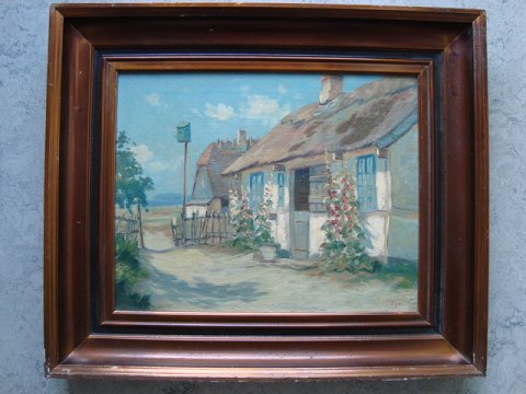 Maleri af Frederik Engelfeldt - Bondehus med stokroser.