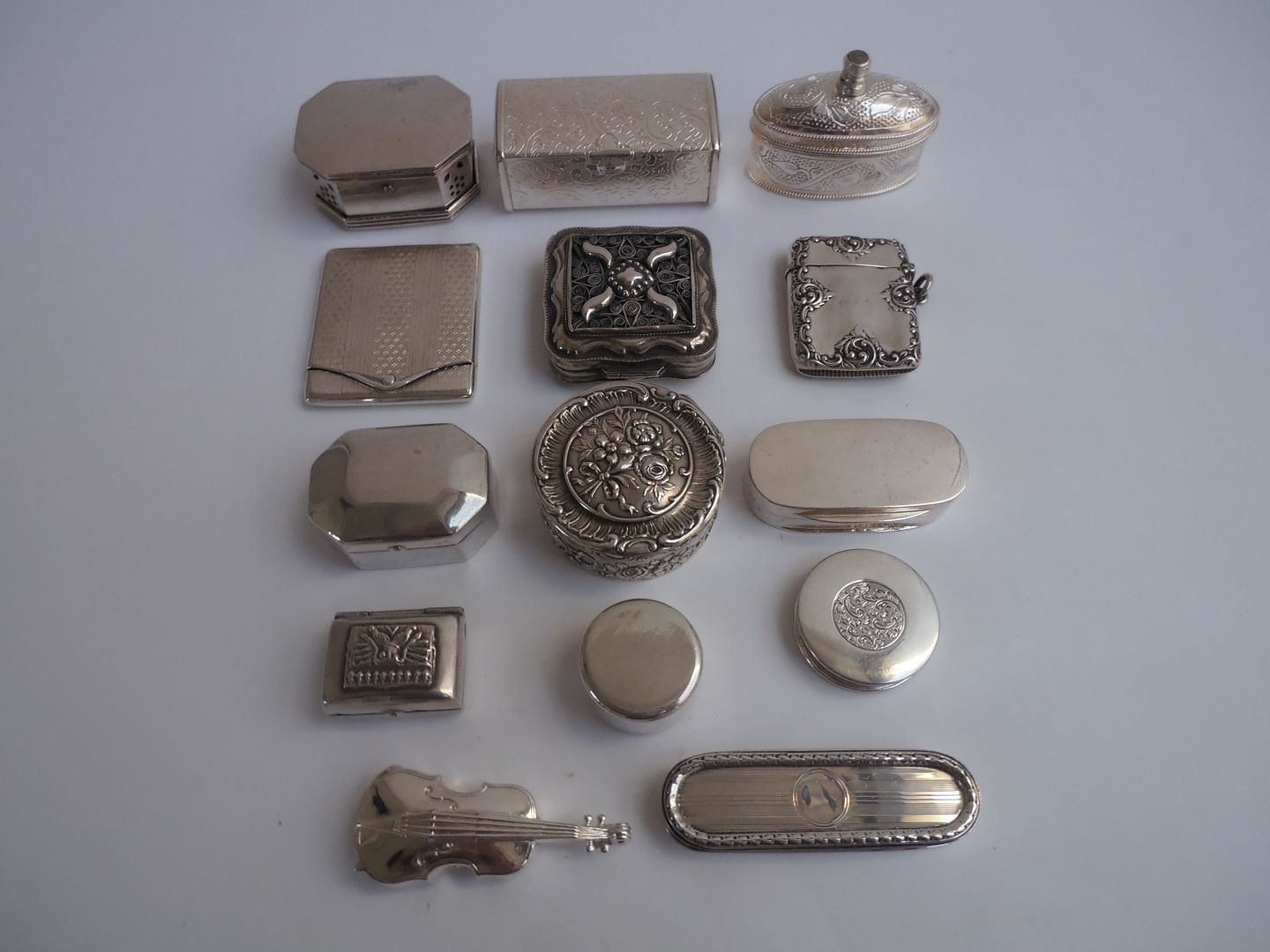 Pilleæsker af sølv og plet, Frankrig og England ca. 1920.