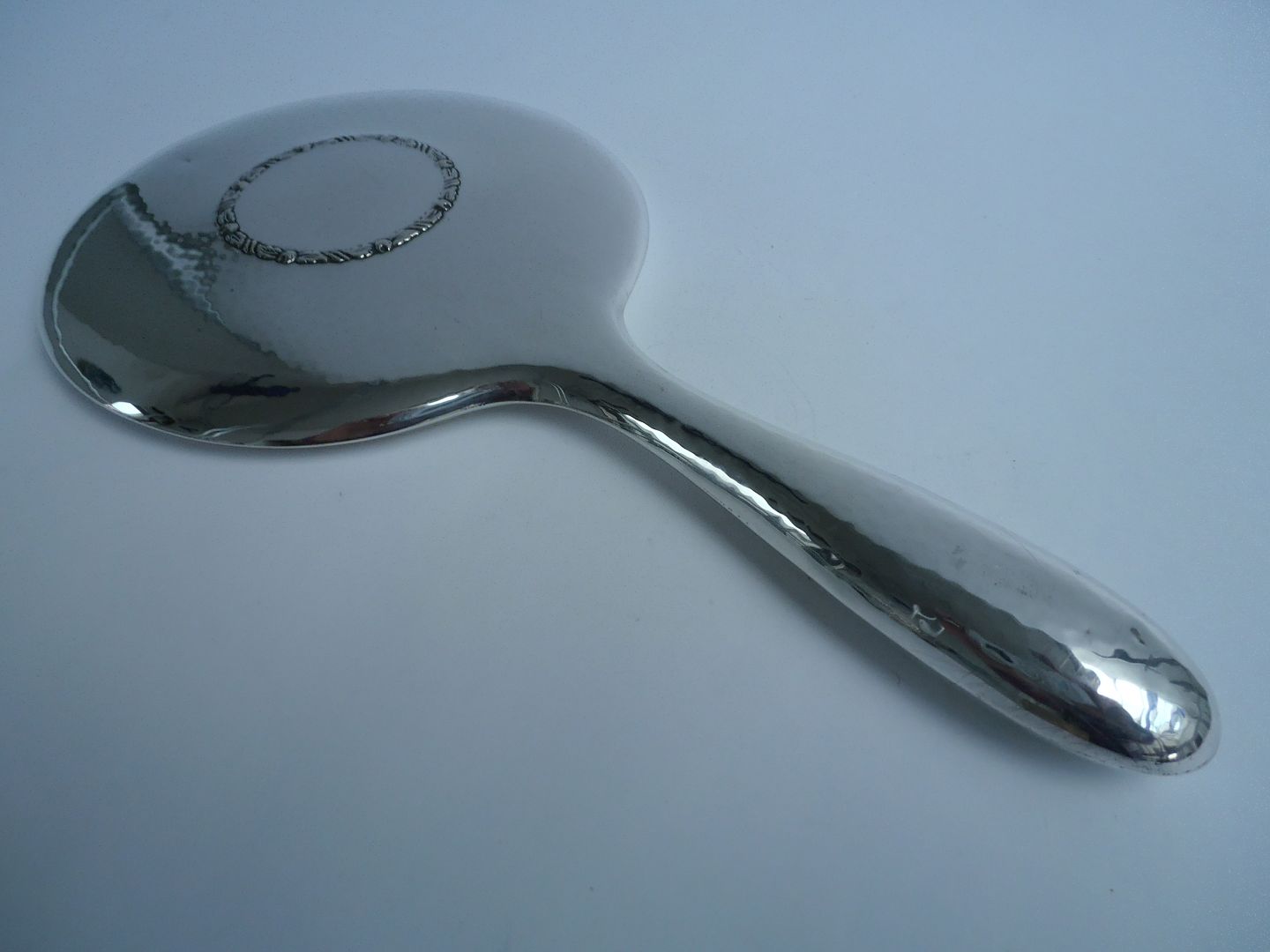 Håndspejl af sølv m. dekoration på bagsiden, Danmark ca. 1920.