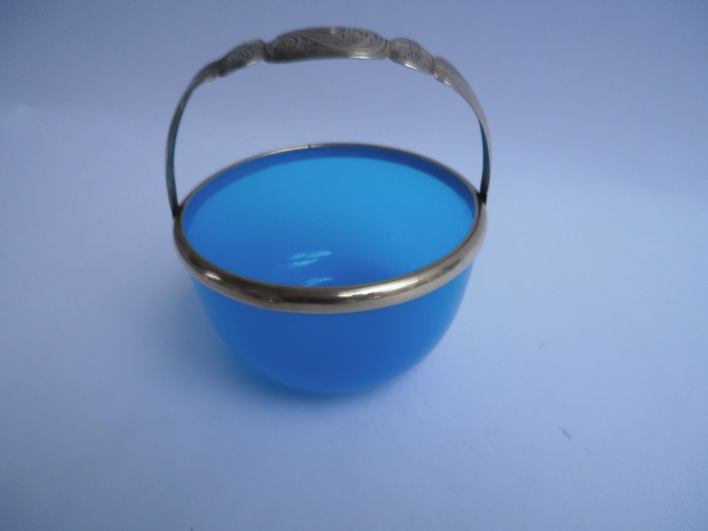 Sukker skål af blåt opaline m. messingkant og hank, Frankrig ca. 1880.