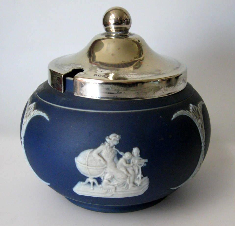Tunstall marmalade jar, 1916, England. Bisquit figures on blue ground. With silver-plated lid. Stamped: Tunstall, England. Dia .: 11 cm. H: 10 cm. Perfect condition.