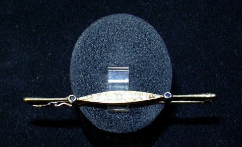 Guld 14 k Broche med 2 safir i siden og 7 natur perler på lige rad i midt