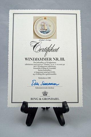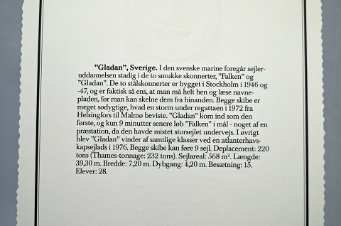 Windjammer seriens nr. 3 er motivet af skibet ‘Gladan’ fra Sverige . Platte nr. 8868/633. Den har en diameter på 27,5 cm. Platten er i perfekt stand, og den er klargjort til ophæng.