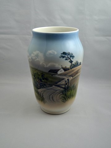 Vase med motiv af hus. H: 26,5 cm. Ø: 15,5 cm. Pris: 1250 kr.