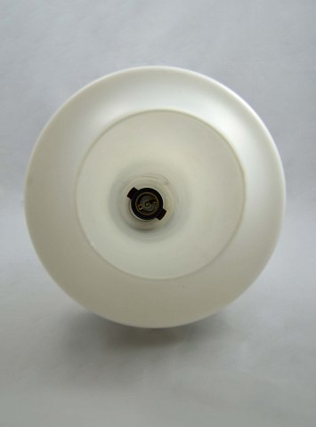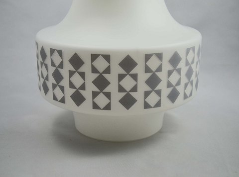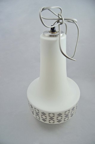 Glaspendel lampe i retro design med grafisk mønster i lys grå farve. Lampen er i pæn stand med intakt mønster. Der er meget små hak i lampens nederste kant. Højde. 36 cm. Ø: ca. 21 cm. Pris: 450 kr.