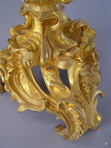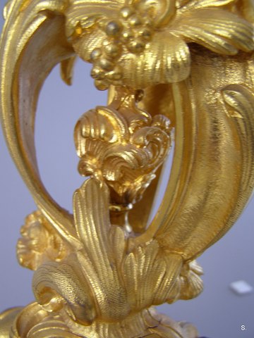 Par franske Rokoko kandelabre 5-armede, af lueforgyldt bronze, rigt prydet med rocailler, blomster og bladværk i form af drueranker, stamme gennembrudt, H: 72 cm.