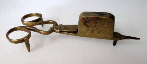 Antique snuffer in brass, 19th century. With engravings on the side and bottom: SSBF 1810 1845 NB 1872, B. & C. B 1950. L .: 15 cm.