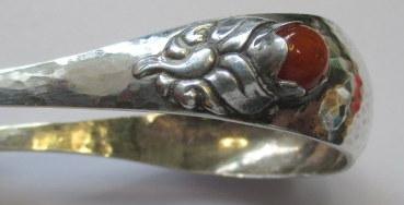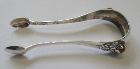 Hamret sukkertang med rav, 1915, Danmark. L.: 12,5 cm. Vægt: 32 gram. Stemplet. Med indgravering fra 1916.