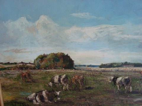 Maleri af Niels Christiansen - Køer og kvier på engen.