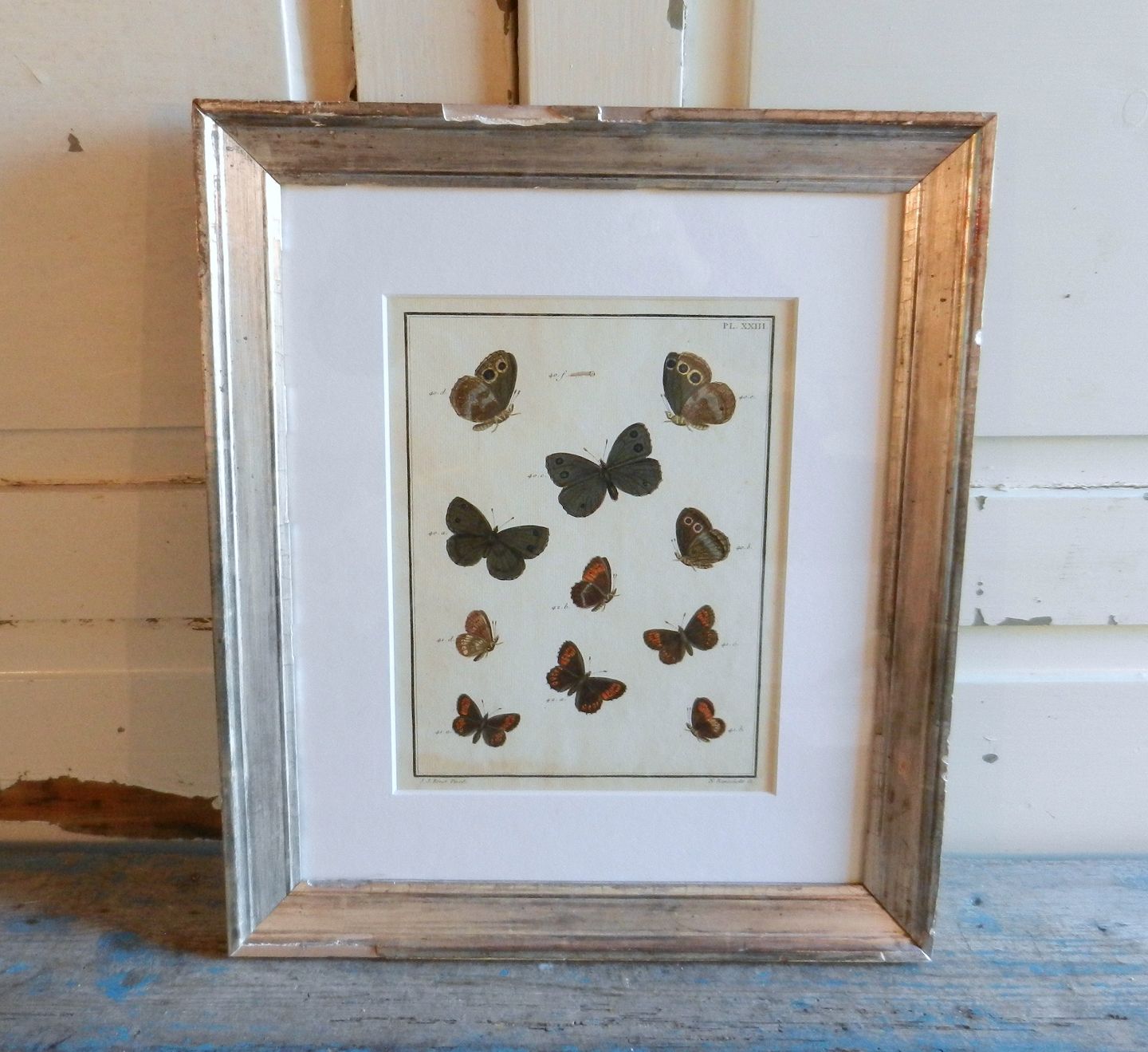 1800tals stort håndkoloreret tryk med sommerfugle i smuk sølvramme