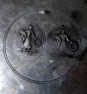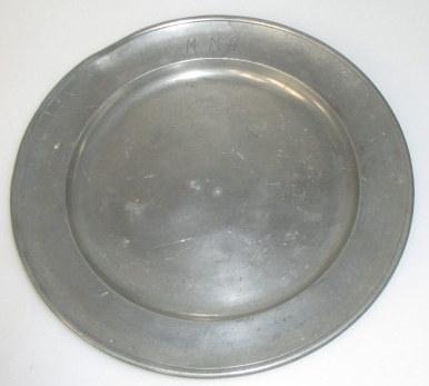 Antik tintallerken, 19. årh. Med stempel på fane: M.M.G. Dia.: 23,4 cm. Stemplet for engelsk tin, og mestermærket: IM.
