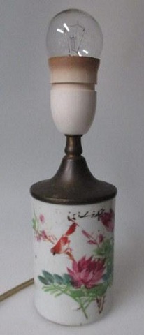 Kinesisk pensel bæger i porcelæn, 19. årh. Polykrom dekoration med fugl på en gren. Med tekst. Stemplet i bunden. Omgjort til el lampe. H.: 10,5 cm.