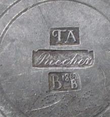 Kaffe kande i tin, 1862, Tyskland, mester: Riechen. Rund fod, glat korpus. Med hank i træ og lågknop i ben. Delvis 8 kantet tud. H.: 27 cm. Stemplet i bunden: TA Riechen. BB 1862. Yderligere i bund indprikninger med navn og årstallet: 1875. Hanken er limet og lågbeslag revnet.