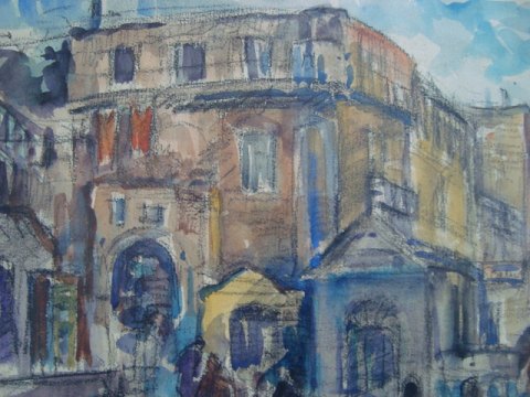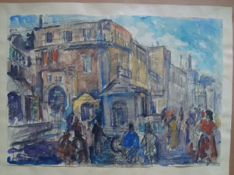 Akvarel af Aksel Lundgreen - Folkeliv, Paris 1952.