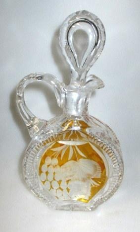 Bømisk karaffel med prop, 20. årh. Klar krystal masse med gult overfang med slibninger. H.: 20 cm.