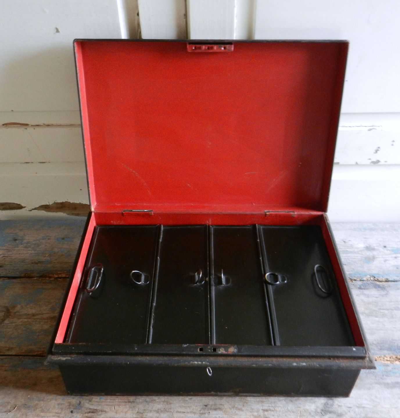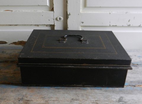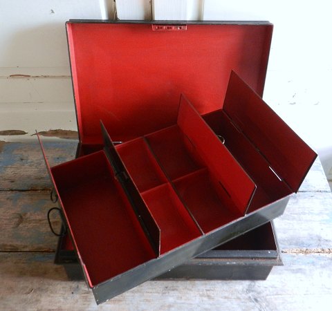 Stor gammel pengekasse med fire rum, den inderste kasse kan tages op. kassen er fremstillet i jern, fremstår med nøgle.