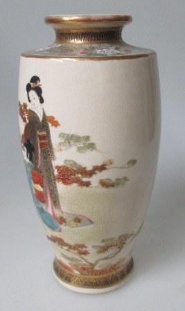 Satsuma vase, 19. årh. Fajance. Dekoration af kimono klædte kvinder i et landskab. Topdekoration i form af roser. Polykrom dekoration med forgyldninger. H.: 13 cm. Stemplet med to kararakter mærke. Virkelig et flot stykke.