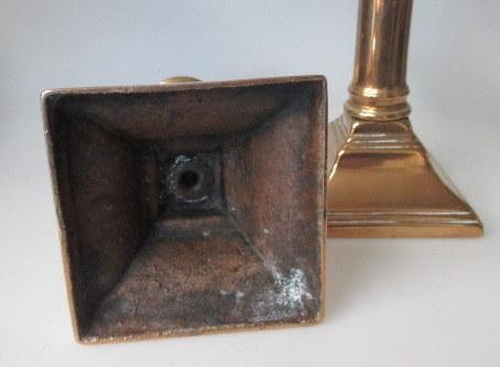 Par danske 1800-tals stager i messing. Kvadratisk fod, glat stamme. Den ene krave med revne. H.: 17 cm.