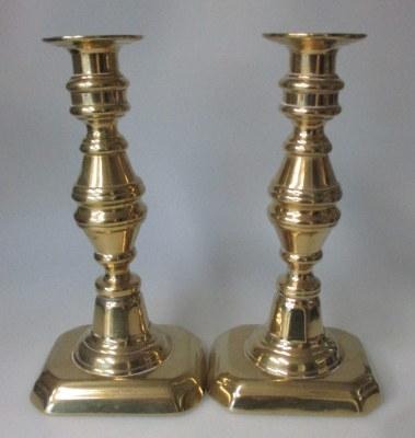 Par engelske messingstager, 19. årh. Ottekantet fod og profileret stamme. H.: 21 cm.